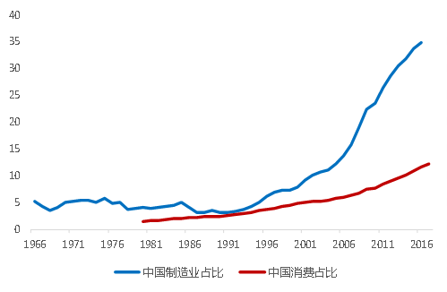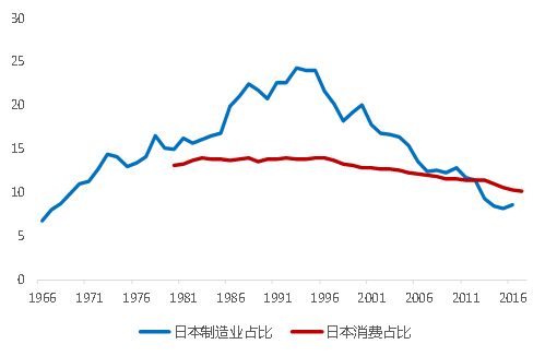 第三个观点,应大规模鼓励国内消费升级和消费增长。在贸易战背景下,我们只能靠国内的消费增量,使制造业升级不再依靠出口拉动,制造业的成功升级又反哺消费升级。如下图所示,日本制造业增加值占G20的比重和日本居民消费占G20的比重在80年代末相差10个百分点,贸易战结束后,失去外需市场的日本制造业占比向消费回归,目前不到10%。目前,中国制造业增加值占G20比重约三分之一,而消费占比只有10%,制造业增加值与居民消费占比之差是日本当初的两倍以上。如果走日本的路,中国制造业增加值的占比会向消费占比收敛。如果中国要避免重走日本的老路,就必须把消费占比拉起来,支撑制造业占G20的比重,使之稳中有升,实现中国制造业的升级。按照过去10年的中美增速外推,中国GDP将于2026年左右超越美国成为世界最大的经济体,而居民消费支出总规模则将于2037年左右超过美国,成为全球最大的消费市场。或许,到那个时候,中美之间的贸易摩擦才能化解于无形。