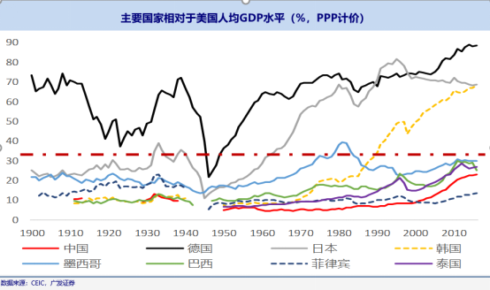 第二个观点,短期内应该避免中美贸易战白热化,能缓则缓。未来10年,是中国跨越“中等收入陷阱”的关键十年。下图为1900年开始到现在,按照购买力平价测算的每个国家的人均GDP相对于美国的比重。从图中看出,一个国家的人均GDP占美国的三分之一,是这个国家中等收入陷阱的门槛。从历史数据可以看出,日本在上个世纪六十年代突破这个门槛,随后韩国在八十年代再次成功跨越这一水平。然而,九十年代初,日本人均GDP占美国的比重达到峰值,之后有所回落到80%左右,之后再也没有上升,可以认为已经掉入“高等收入陷阱”。现在中国人均GDP占美国人均GDP的25%,三至五年之后很可能升至美国的三分之一。中美贸易战对美国只是增长速度的放缓,而对中国则面临掉入中等收入陷阱的考验。中美贸易冲突升级,可能会导致国内进一步放宽货币政策,推高房价,之后房地产价格泡沫的破灭又导致本币贬值,随之我们整个势头会被遏制。中国应在未来十年的时间里尽量避免与美国打贸易战,为结构性改革和经济转型升级赢得时间。